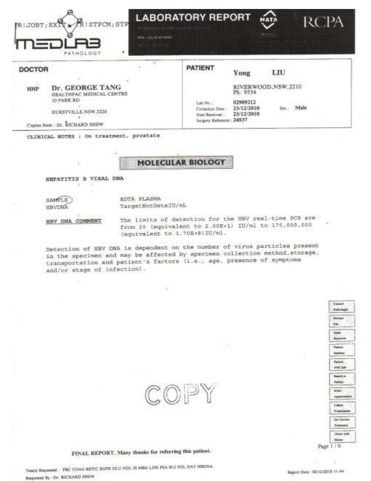 刘先生现在不但过去这么多的肿瘤与癌细胞一个都找不到了,而且连致癌症的病毒也没有了,附上医院给刘先生的医学报告,再一次证明师父的法门是殊胜的。